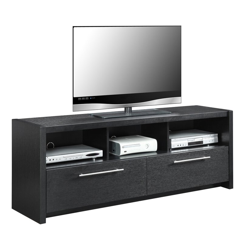 Anchor your entertainment center with this contemporary 65″ TV stand. Made of durable manufactured wood, it features a rectangular shape with streamlined side panels and silver metal bar pull hardware. The stand provides three open cubby shelves with wire-sorting back vents, perfect for organizing your cable box, entertainment console, and DVD player. Additionally, two drop-down doors offer deep and discreet storage for your other audio/video accessories.
