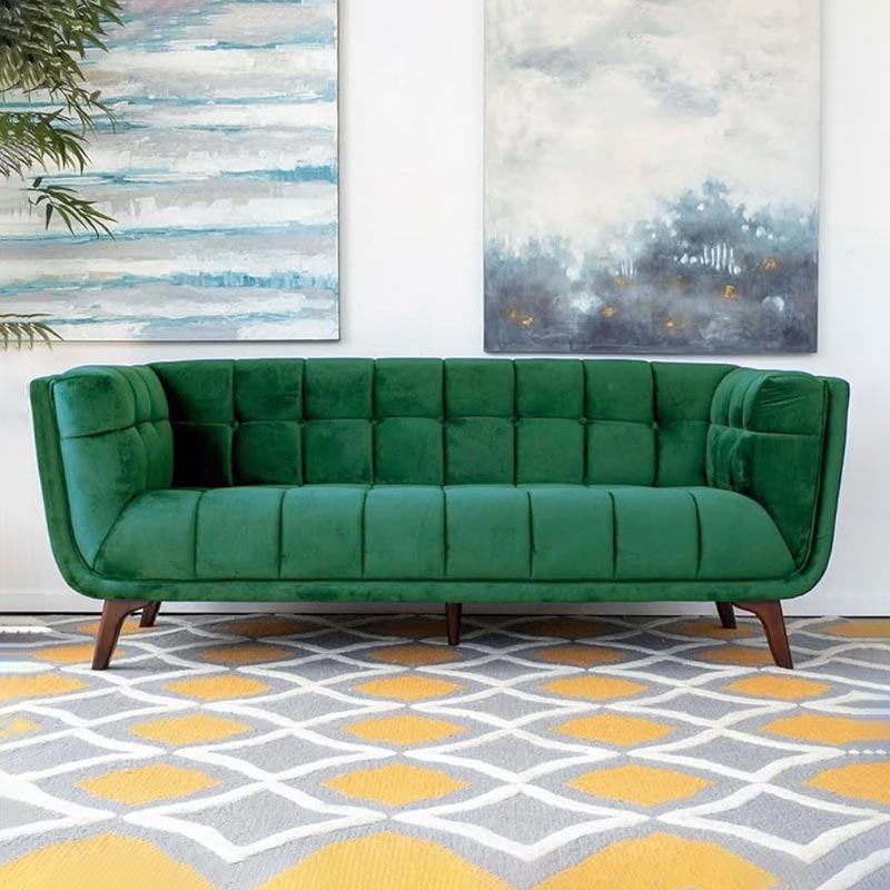This three-seater sofa boasts a clean cushion design that provides cozy seating, allowing you to fully enjoy your Friday night movie experiences in the comfort of your own home. The plush cushions and tufted velvet upholstery create an inviting and luxurious seating area that enhances relaxation.