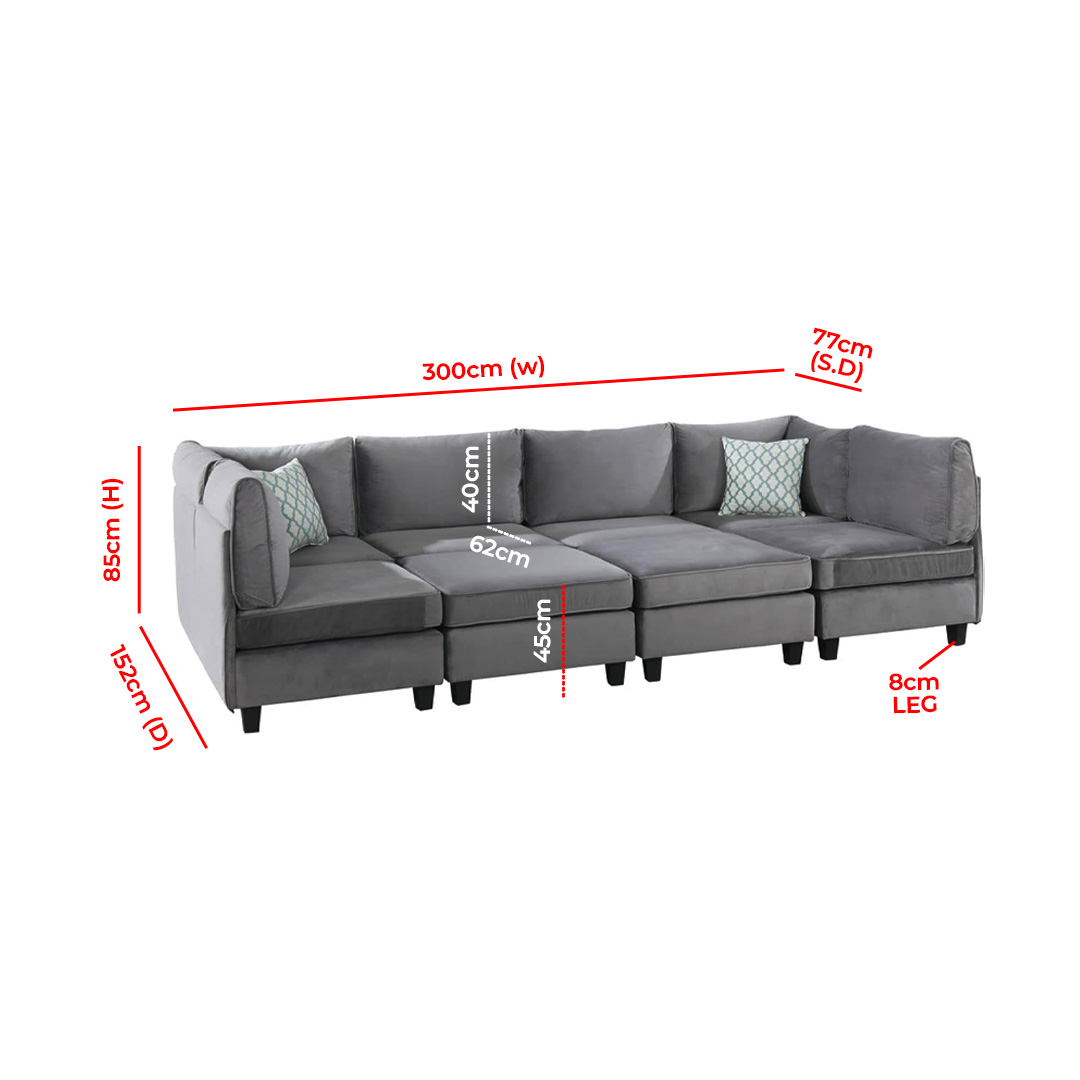 Wrapped in lavish grey velvet upholstery, this modular sofa offers a plush seating experience. The foam and sinuous springs provide unparalleled support, guaranteeing a cozy and impressive seat. Whether it’s accommodating large family gatherings or hosting intimate get-togethers with friends, this sofa delivers comfort and elegance in equal measure.