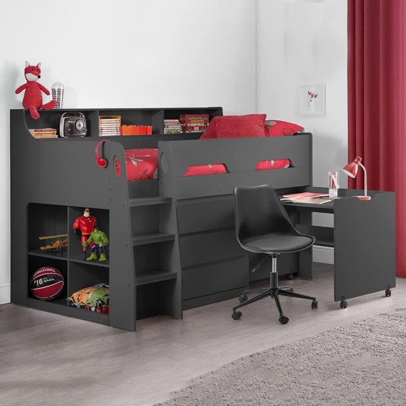 The Aries Mid Loft Bed with Desk and Shelf, a space-saving and versatile solution for your child’s bedroom. This fun and multi-functional loft bed offer a range of features designed to maximize functionality and creativity. With a built-in chest of drawers, shelves, and a convenient pull-out desk, your little one will have their own dedicated space for sleeping, playing, and working.