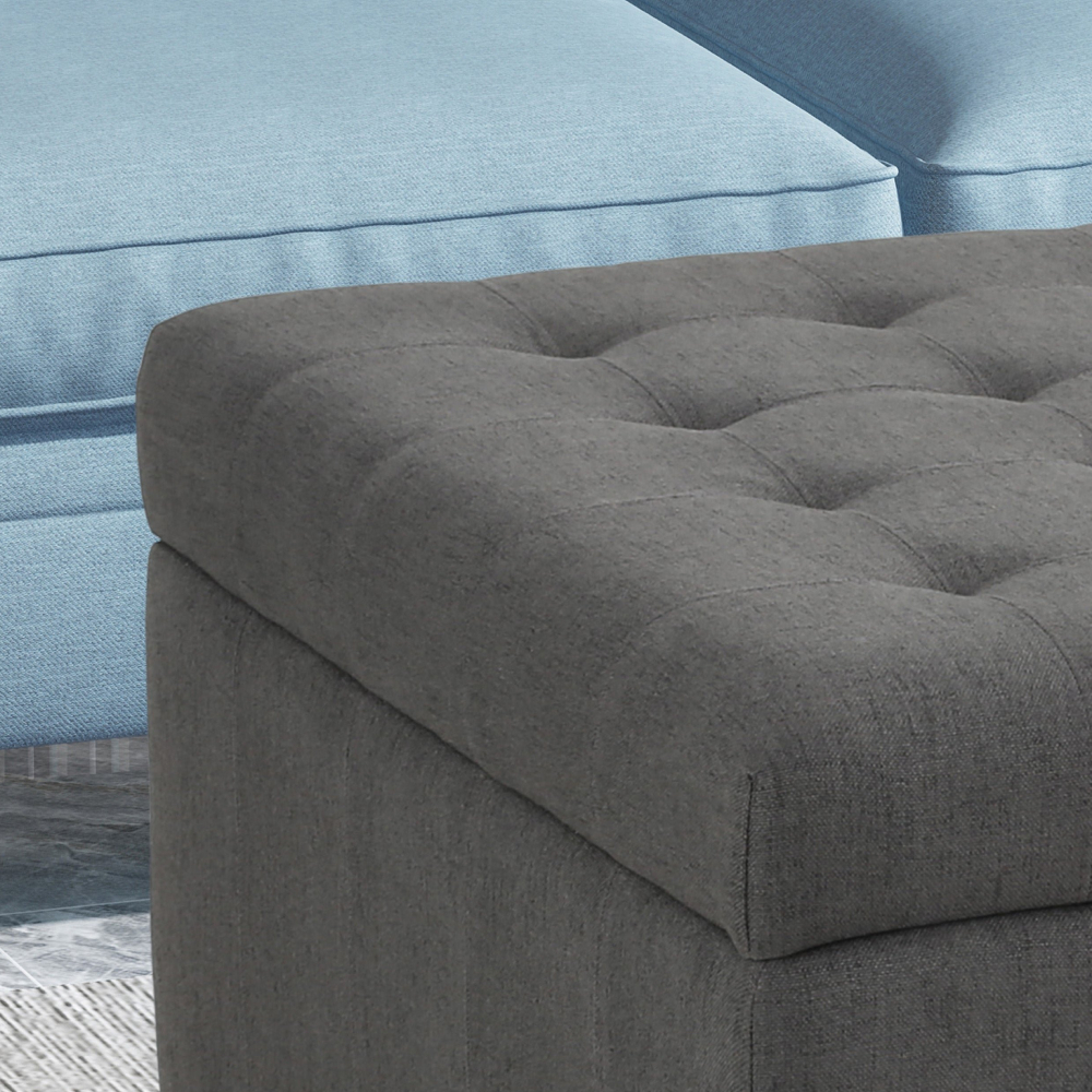 Crafted with meticulous attention to detail, the ottoman boasts a sleek and refined upholstery that complements various decor themes. The lid features delicate tufted waffle stitching, adding a touch of class to the design.
