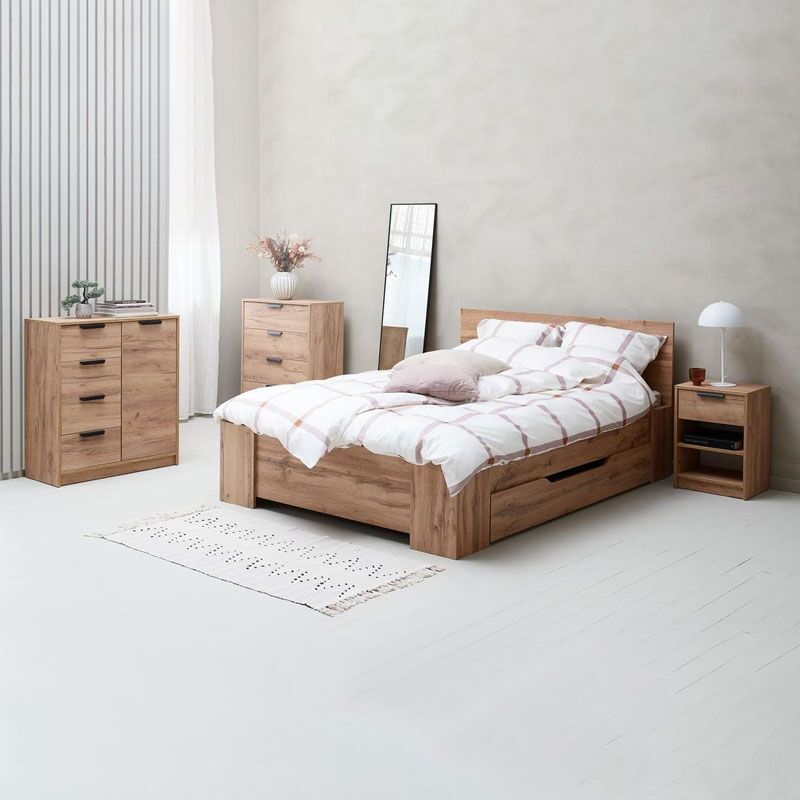 - With a drawer and open shelves for your nighttime essentials, the bedside table complements the chest and bed frame with a classic oak finish.