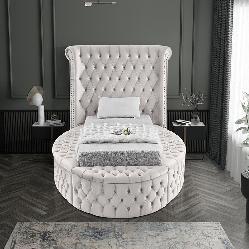Our opulent Luxurious Round Bed With Storage, is a pinnacle of style and functionality for your bedroom. This fully upholstered bed boasts a rich texture and tone, adding depth and character to your space. The tufted detail and graceful design of the head board enhance its charm, creating a visually captivating centerpiece.