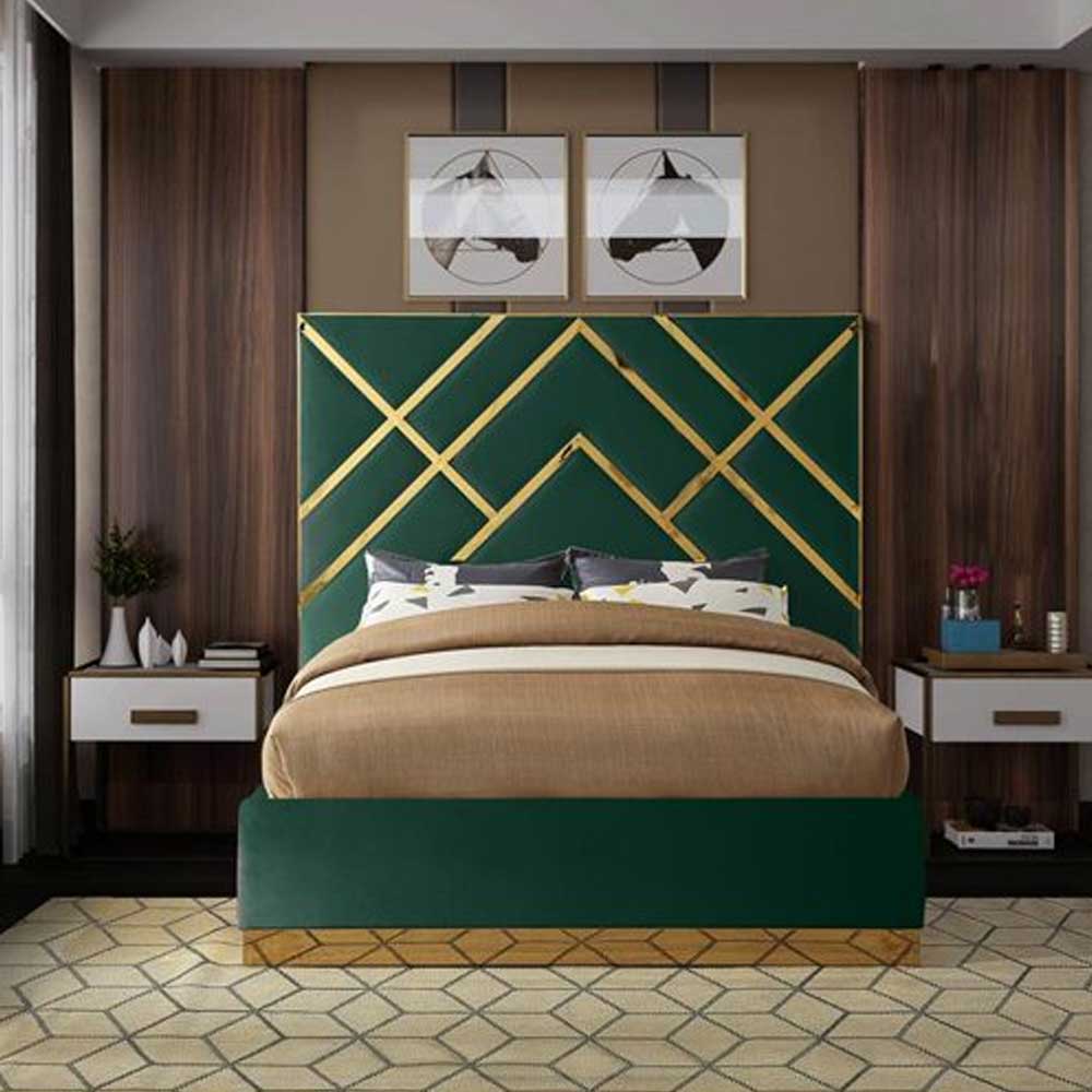 The Velvet-Covered Bed with Cushioned Frame. This bed features a stunning velvet upholstery in a gorgeous green shade that adds a touch of elegance and luxury to your space. Moreover, the polished gold metal geometric design and base create a striking contrast and a modern flair. Additionally, this bed comes with full slats, so you don’t need to worry about buying a box spring or foundation. You can simply enjoy the chic and cozy look of this bed.