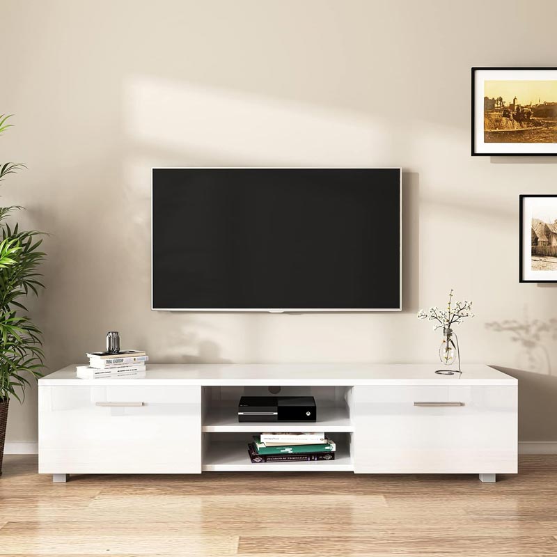 This TV unit is made of good materials that last a long time. The outside is smooth and shiny, and the drawer is shiny too but in a different colour. This makes your living room look nice. With its ample storage space, including a stand top, two doors, and a shelf, this TV unit provides the perfect solution for organizing your media and entertainment essentials. It can accommodate most TV types, such as 3D, flat screen, LCD, LED, and curved TVs, supporting TVs up to 70″ in size.