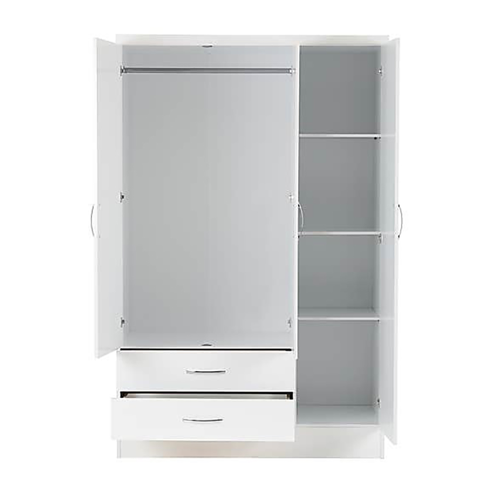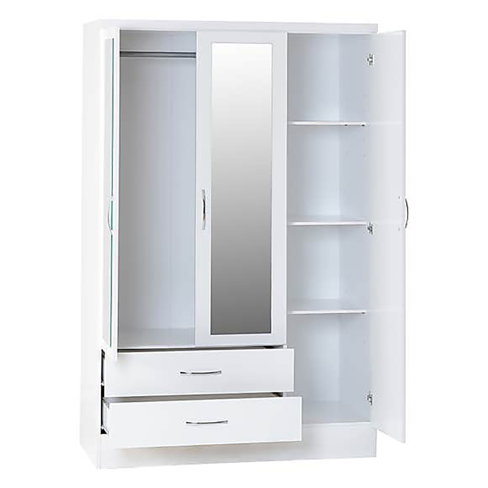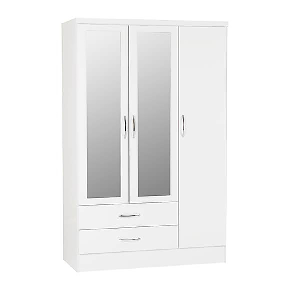 Paragon Furniture Nevada White Mirror Door Wardrobe with Drawer is a stylish storage solution for your home. This wardrobe boasts a modern design with white finished front that beautifully complements the sleek metal handles. With ample storage capacity and a generous hanging space provided by the metal rail, the Nevada Wardrobe is designed to meet all your storage needs. Organize your clothes, accessories, and more with ease, while adding a touch of contemporary elegance to your space.