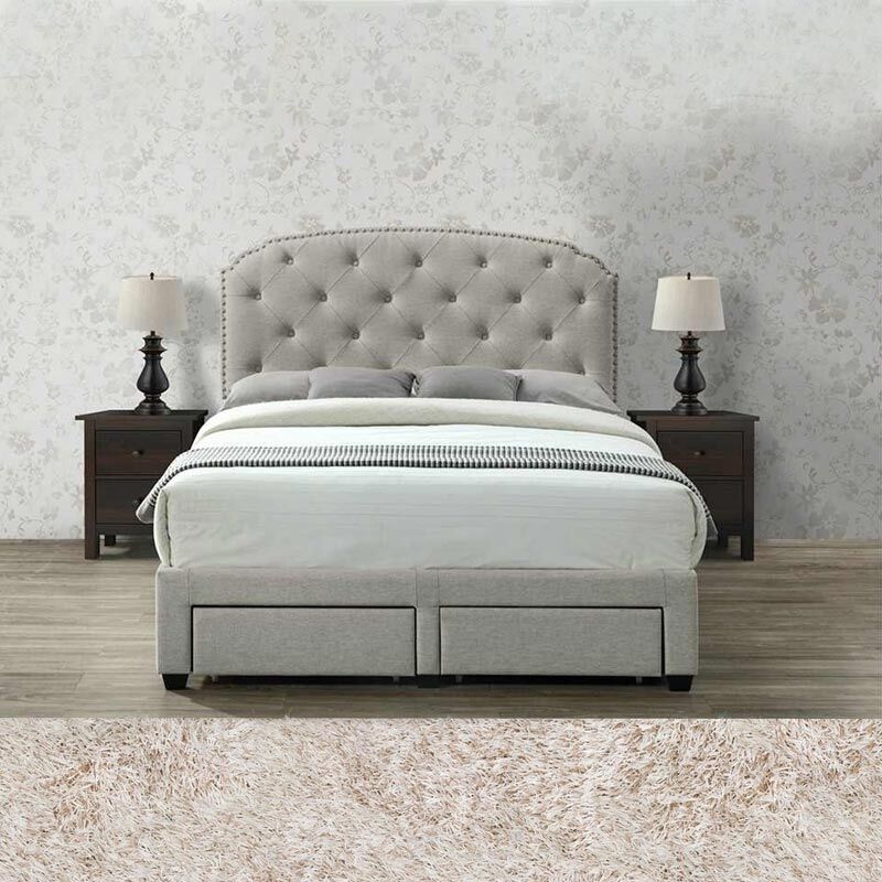 Elevate your bedroom with the Pogradec Tufted Drawers Storage Bed, a luxurious and practical addition to your space. This fully upholstered bed frame offers a delightful blend of texture and tone, infusing your room with a sense of elegance. The subtle piping detail and gentle curve of the headboard further enhance its allure, creating a captivating focal point.