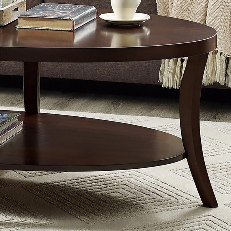 This round center table will add style and functionality to any living room. The rich espresso finish matches any style of decor. The large tabletop can be used to showcase your favorite items, or simply enjoy a cup of coffee. It also has a shelf hidden at the bottom for extra storage of books, blankets, or magazines. This round centre is a beautiful and functional addition to your home.