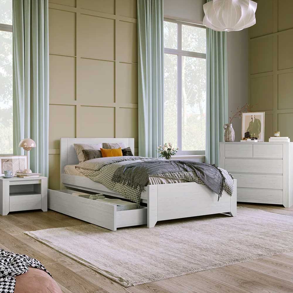 Our Twin Bed Set with Wood Nightstand and Chest. This bedroom set features a twin-size bed, nightstand, and chest, all made of MDF with an off-white finish that adds a touch of elegance and charm to your space. Moreover, this bed has a headboard, footboard, and side rails that provide stability and comfort, ensuring that you sleep well every night. Additionally, this bedroom set comes with a nightstand and chest that have two drawers each for storage and organization.