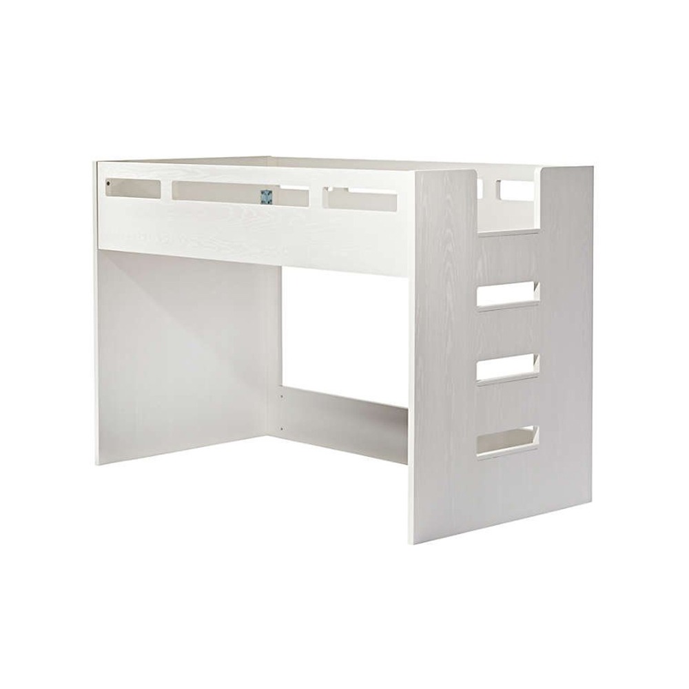 The Glaze Twin Loft Bed in White with Right Ladder, a space saving solution designed to maximize your floor space. This loft bed offers a smaller profile compared to traditional loft beds, providing even more space-saving capabilities.